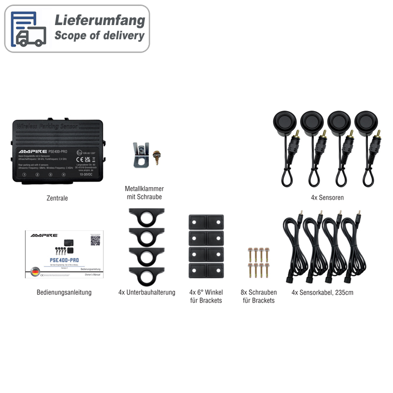 Wie ein Beifahrer der Sie mit sicherem Auge einweist, hilft Ihnen die wasserdichte AMPIRE Heck-Einparkhilfe bei dieser kleinen Herausforderung - nur noch viel schneller und zuverlässiger. Dieses, speziell für offene Fahrzeuge und Anhänger entwickelte System aktiviert sich automatisch mit dem Einlegen des Rückwärtsgangs und ermöglicht Ihnen eine lückenlose Überwachung des hinteren Bereichs. Sie werden rechtzeitig akustisch vor Hindernissen gewarnt und somit vor Personen- und Sachschäden bewahrt - und das Einparken wird zum Kinderspiel. Die Sensoren können samt den mitgelieferten Unterbauhalterungen unter Anhänger, pritschen oder anderen offenen Konstruktionen befestigt werden. Die Kabellose Übertragung zum Lautsprecher geschieht auf 2.4GHz und ist für Fahrzeuge und Gespanne bis zu einer maximalen Länge von 30m geeignet.