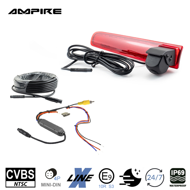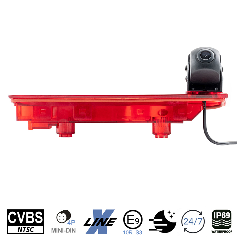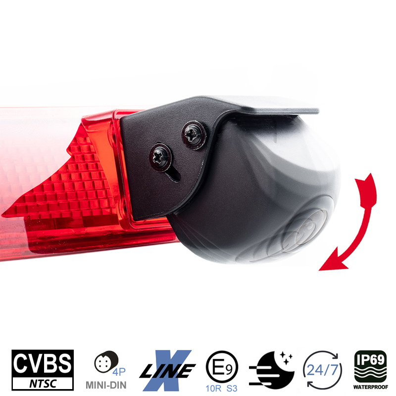 Fahrzeugspezifische CVBS (NTSC) Rückfahrkamera für den VW Transporter T5, T6 und T6.1 bis Modelljahr 2021 mit Flügeltüren. Die KVX-T6-F wird gegen das werkseitige linke Bremslichtglas einfach ausgetauscht. Ab dem Modelljahr 2022 könnte das Leuchtmittel im Bremslicht verklebt sein und die KVX-T6-Fkann nicht mehr montiert werden.
