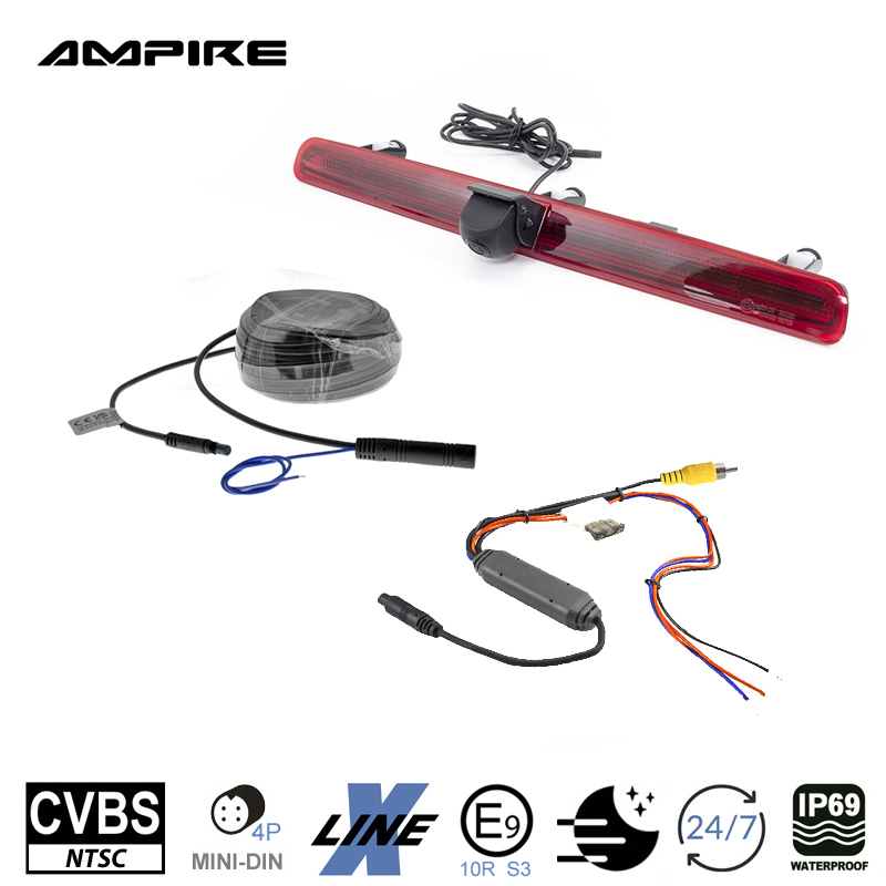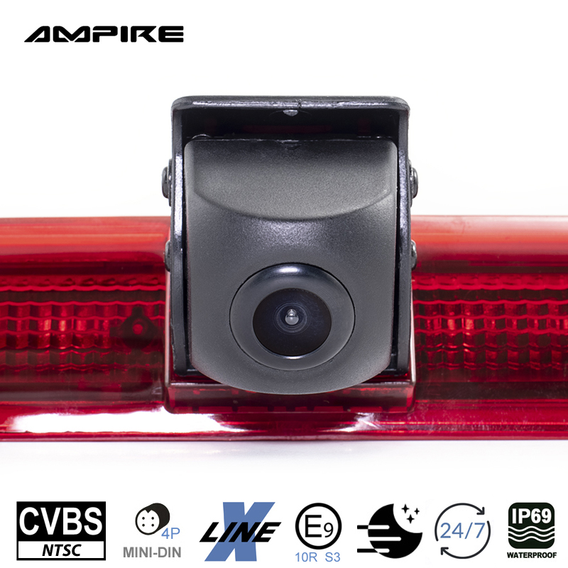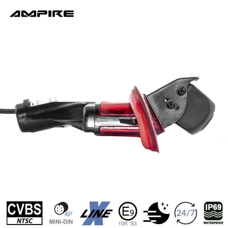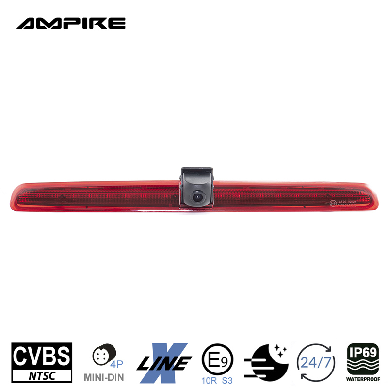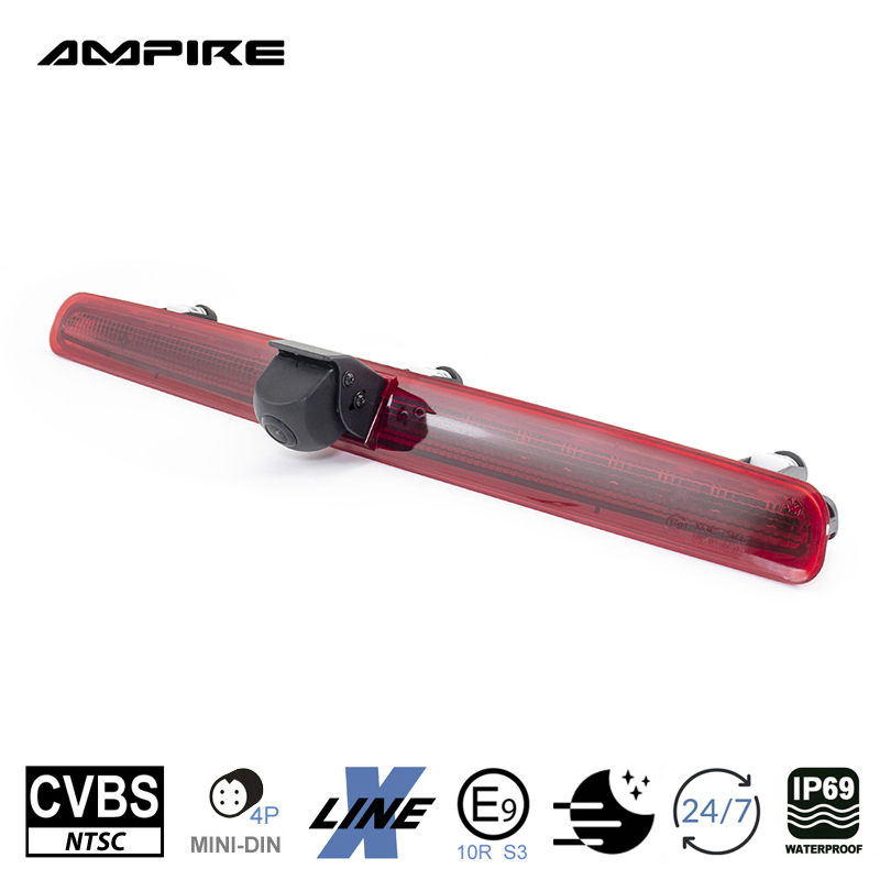 Fahrzeugspezifische CVBS (NTSC) Rückfahrkamera für den VW Transporter T5 mit Heckklappe. Die KVX-T5-H wird gegen das werkseitige linke Bremslichtglas einfach ausgetauscht.