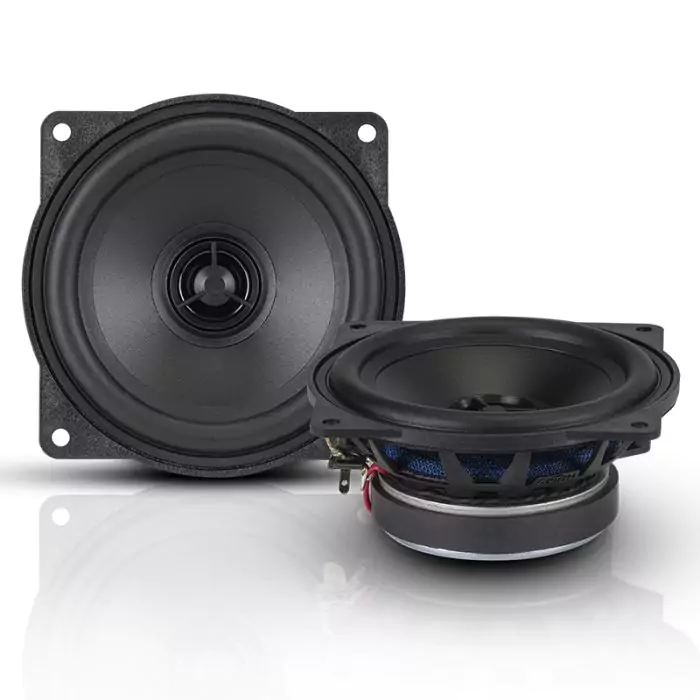Das neue 10 cm 2-Wege Soundsystem ist als Punktschallquelle konstruiert. Der 13 mm Hochtöner mit ferrofluid-gekühltem Neodymantrieb liegt auf einer Ebene mit der Tieftönermembran und ermöglicht so ein phasengleiches Abstrahlen der jeweiligen Frequenzanteile. Phasenverschiebungen im Übergangsbereich der Frequenzanteile, die bei herkömmlichen herausstehenden Hochtönern entstehen, gehören somit der Vergangenheit an. Das Ergebnis ist eine transparente, klare Musikwiedergabe mit hoher Dynamik.