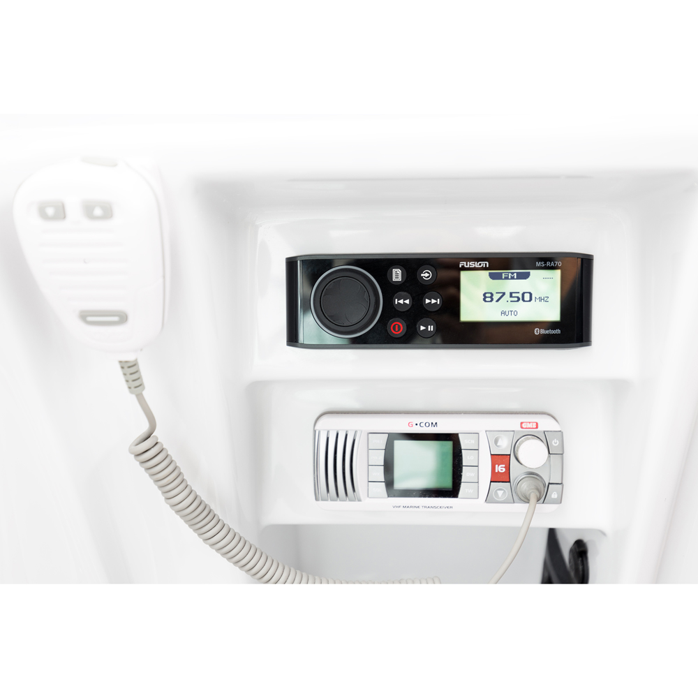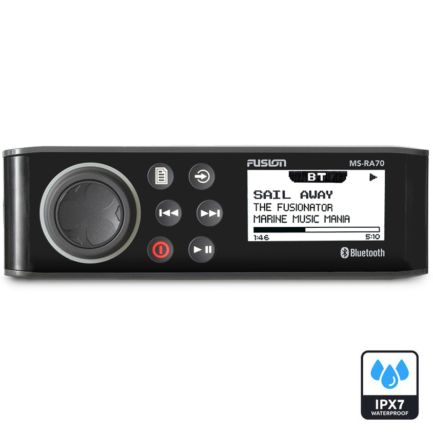 Ersetze dein vorhandenes 1-DIN Radio problemlos durch ein vielfältiges Marineradio der RA70-Serie von Fusion®. Die RA70-Serie umfasst zwei Varianten: das RA70 und auf Anfrage das RA70N mit NMEA2000 zur Steuerung über ihren kompatiblen GARMIN Kartenplotter.