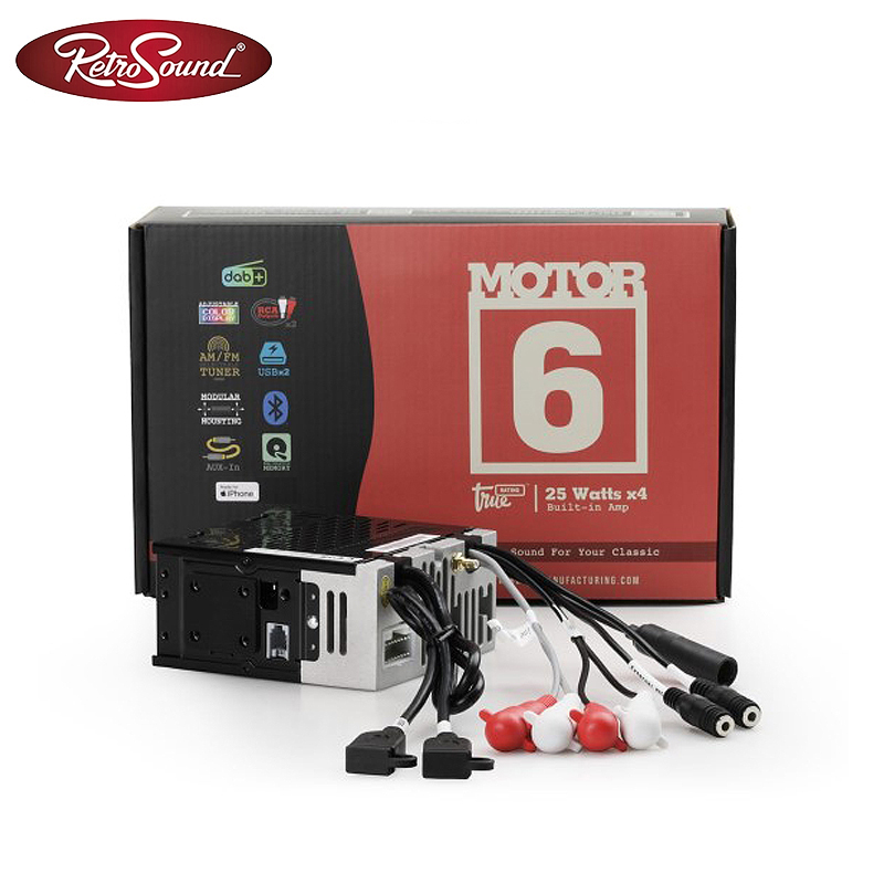 Es besitzt eine Bluetooth Freisprecheinrichtung, A2DP Audio-Streaming und Apple iPhone Steuerung. Die Touchscreen Bedienung des Apple iPhone ist weiterhin parallel aktiv. Natürlich unterstützt das Radiomodul "MOTOR-6" auch das flexible, von RetroSound patentierte, "InfiniMount" Befestigungssystem der Bedienregler. Mit diesem Gerät erhalten Sie das Design von Ihrem Klassiker und müssen nicht auf moderne digitale Medien verzichten. Zwei USB- und einen AUX-Eingang auf der Geräterückseite ermöglichen Ihnen eine externe Audioquelle wiederzugeben.