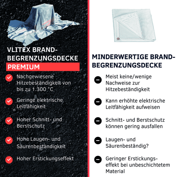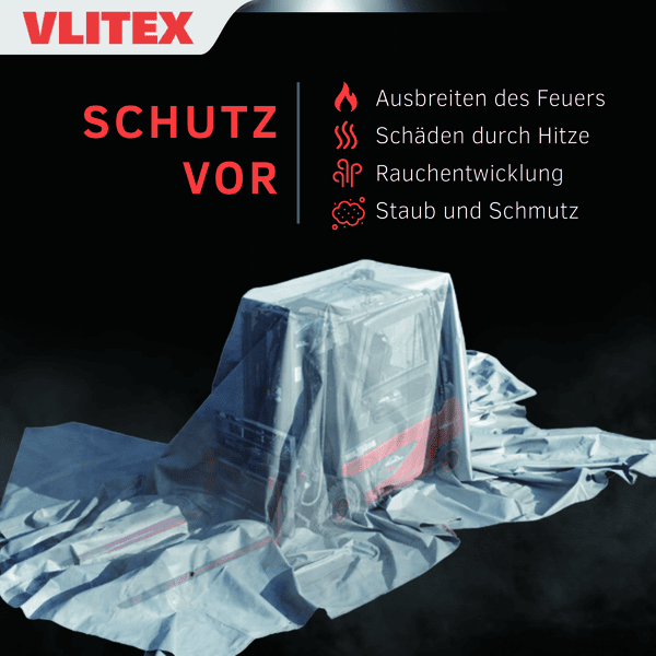 Die Vlitex Brandbegrenzungsdecke PREMIUM mit den Maßen 8 x 10 m wurde speziell zur Eindämmung von Fahrzeugbränden entwickelt – ideal für E-Fahrzeuge, Gabelstapler und andere größere Fahrzeuge. Durch ihr extrem hitzebeständiges Spezialgewebe mit Polymerbeschichtung isoliert sie Flammen, reduziert Rauch und toxische Gase und bietet gleichzeitig Schutz vor Explosionen unter der Decke. Sie erfüllt die Anforderungen der DIN SPEC 91489 und ist mehrfach verwendbar – abhängig von der Brandlast. Die umlaufenden Griffe, Markierungen und die umlaufende Saumverstärkung erleichtern das sichere und präzise Auslegen im Einsatzfall.